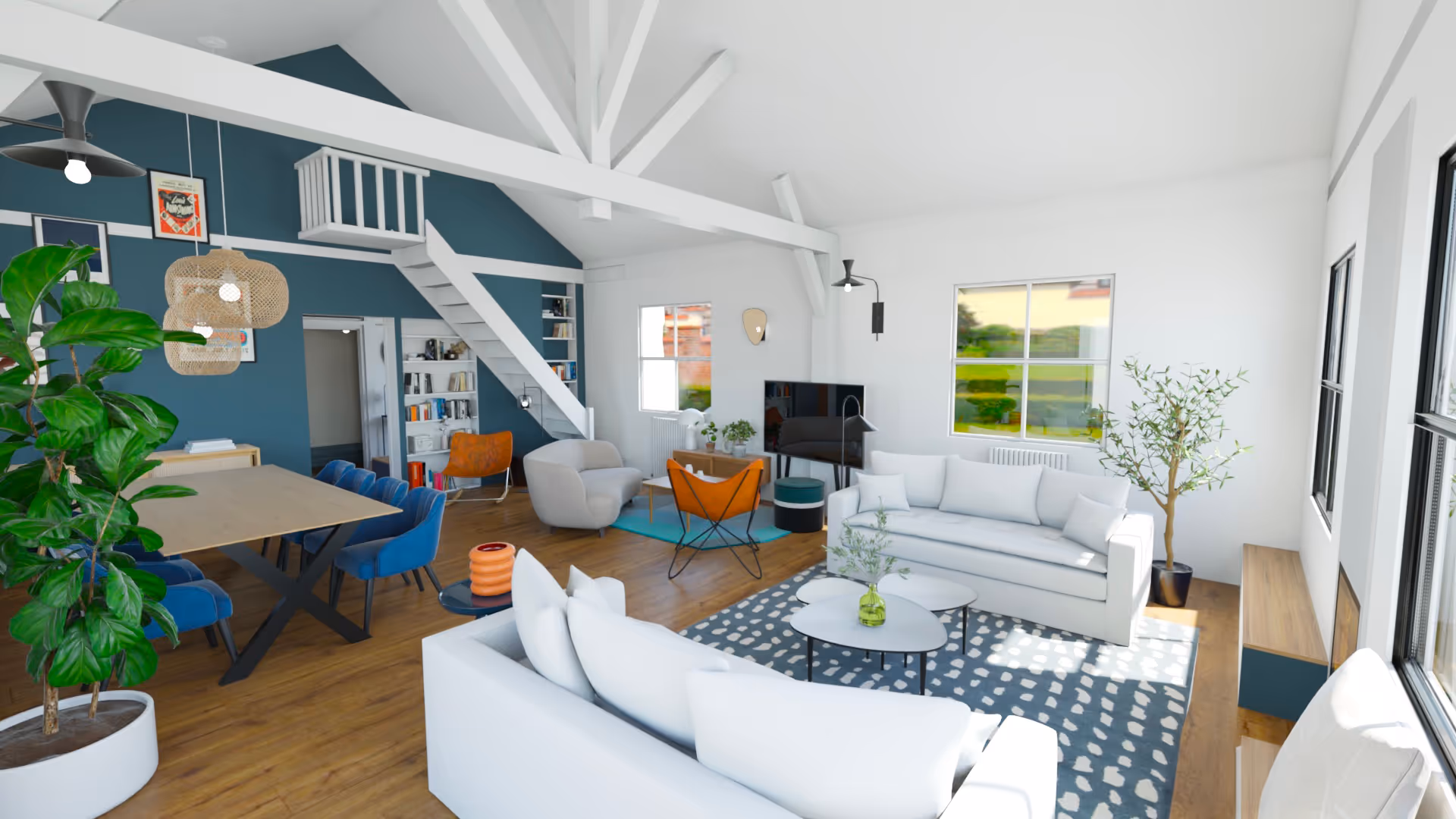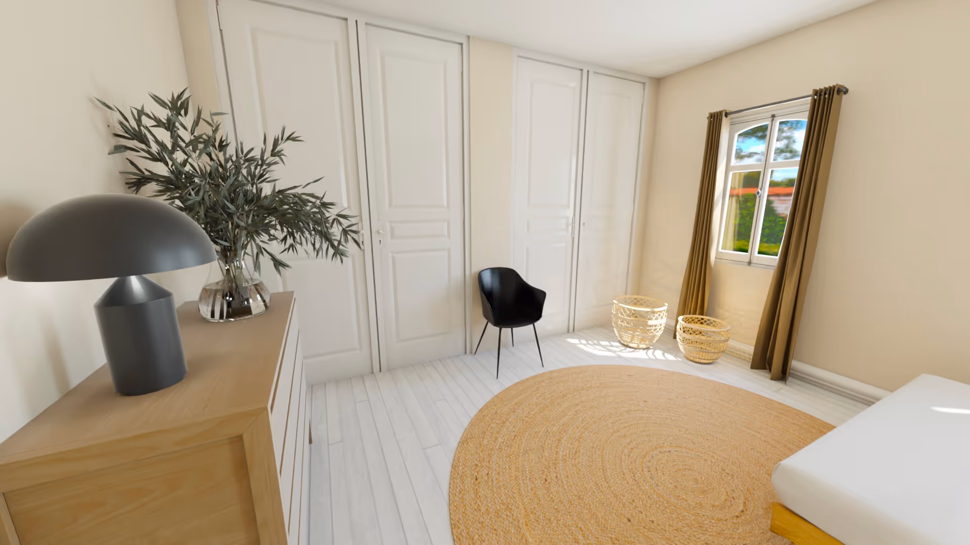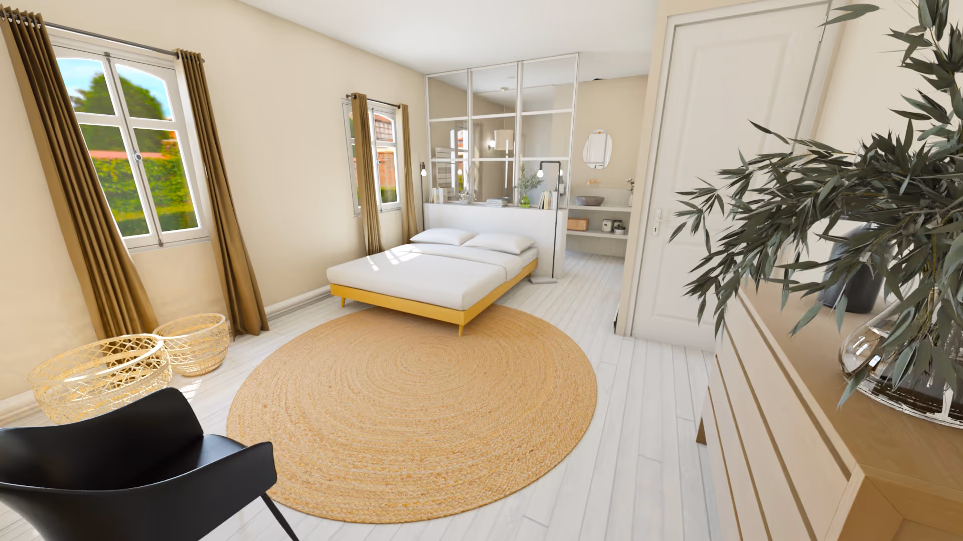 Le défi était de créer différents espaces dans la très grand pièce de vie sans cloisonner. Nous avons joué sur des astuces déco pour structurer l’espace. Dans la chambre parentale, nous avons créé un espace cocooning pour que les clients puissent se mettre dans leur bulle en retrait du monde le temps d’une nuit.. Un très beau projet offert par cette maison atypique au cadre enchanteur
